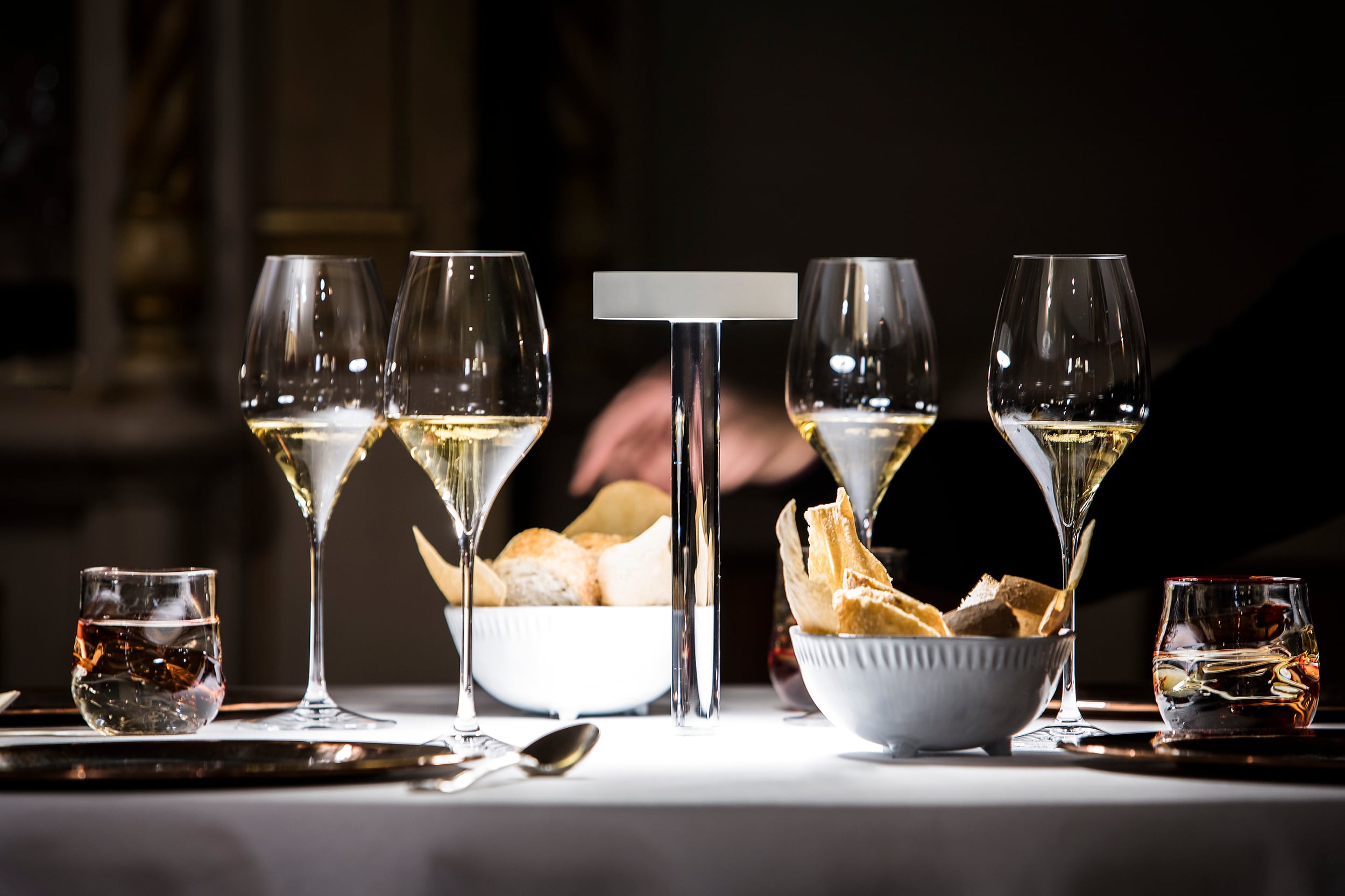 透明なステムは、クラシックな「ミーズ・アン・プラス」で使われるグラスを想起させます。